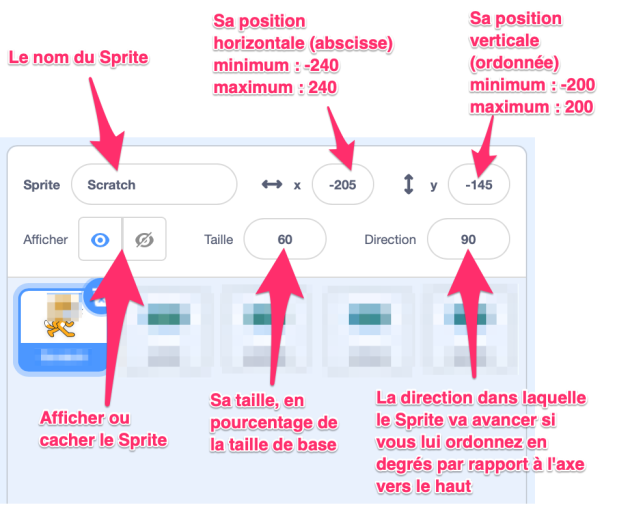 Un fois créé, on peut accéder à un certain nombre d'informations directement dans l'interface. Et l'on peut changer ces informations sans utiliser les blocs d'instruction :
