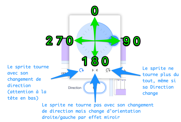 Le bloc "s'orienter à ..." vous aide également avec une roue pour indiquer l'angle.