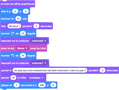 À vous d'essayer de refaire ce script. Et de l'améliorer ! Vous pouvez vous contenter des catégories de blocs suivants : Mouvement, Apparence et Son